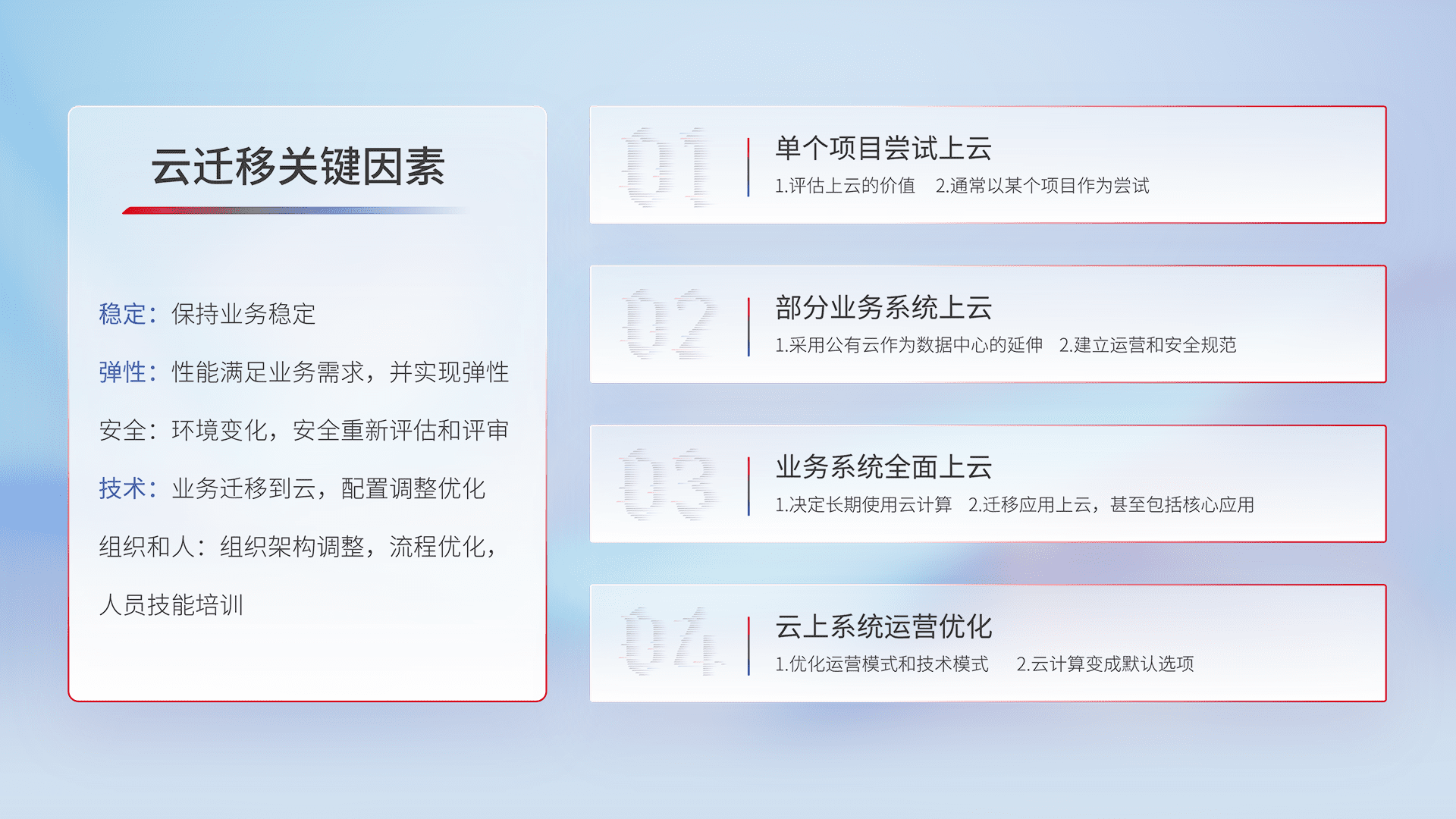 结合实际业务,,从规划设计、、云平台选型、、云原生改造、、、、数据迁移、、集成交付,,,,迁移全过程为客户识别最佳上云路径,,,,做好风险识别管理,,设计网络架构、、身份权限、、、安全审计合规、、操作审计、、、、日志审计、、、监控告警策略、、、多站点容灾设计等,,,对云上基础设施进行整体规划,,提升IT治理水平,,,,以满足弹性、、高可用、、、、高性能的需求。。。。